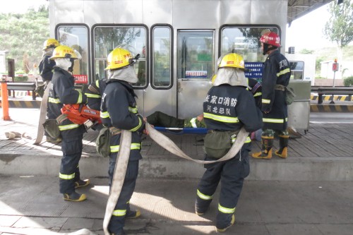 16時演練正式開始,演練模擬收費亭內(nèi)設(shè)備短路引發(fā)火災(zāi),收費員被困收費亭。下花園區(qū)消防大隊在接到火警后迅速趕往火災(zāi)現(xiàn)場。消防官兵到達現(xiàn)場后,一組人員在收費站人員的配合下緊急疏散過往車輛及人員,一組人員迅速拉起高壓水槍沖向著火地點控制火勢,實施救人。最終,在消防官兵和收費站人員同共努力下,火勢得到控制,被困收費員成功解救。整場演練緊張有序,取得了預(yù)期的效果。