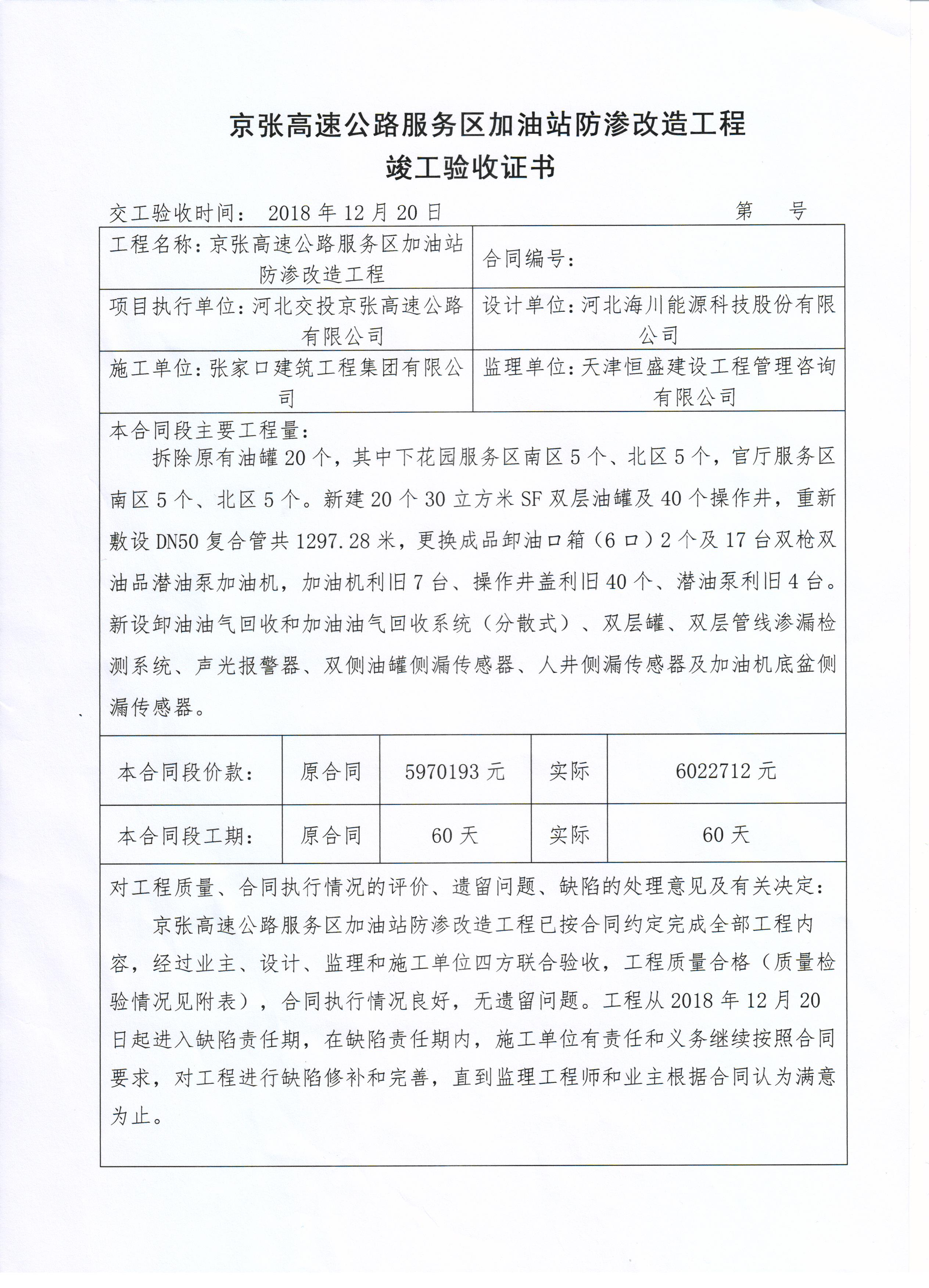 京張高速公路服務(wù)區(qū)加油站防滲改造工程竣工驗(yàn)收證書